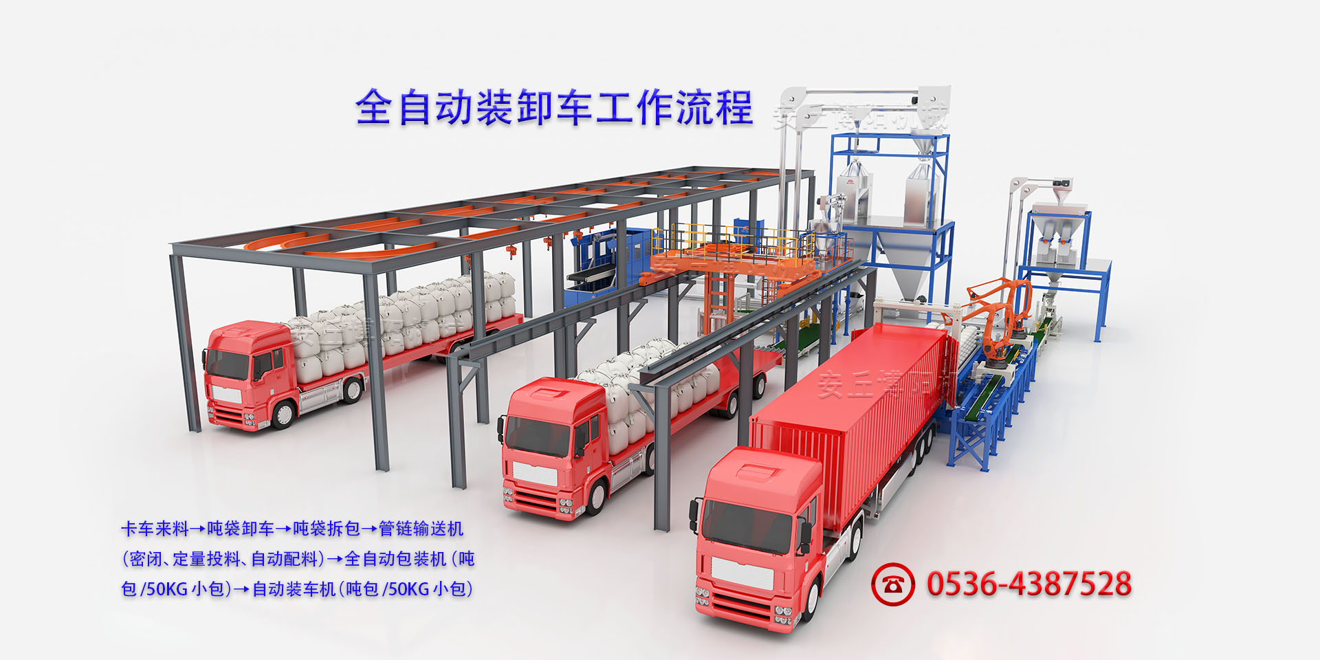 自動配料投料系統(tǒng)→全自動包裝機→碼垛機器人→AGV出入庫系統(tǒng)→自動裝車機生產(chǎn)線